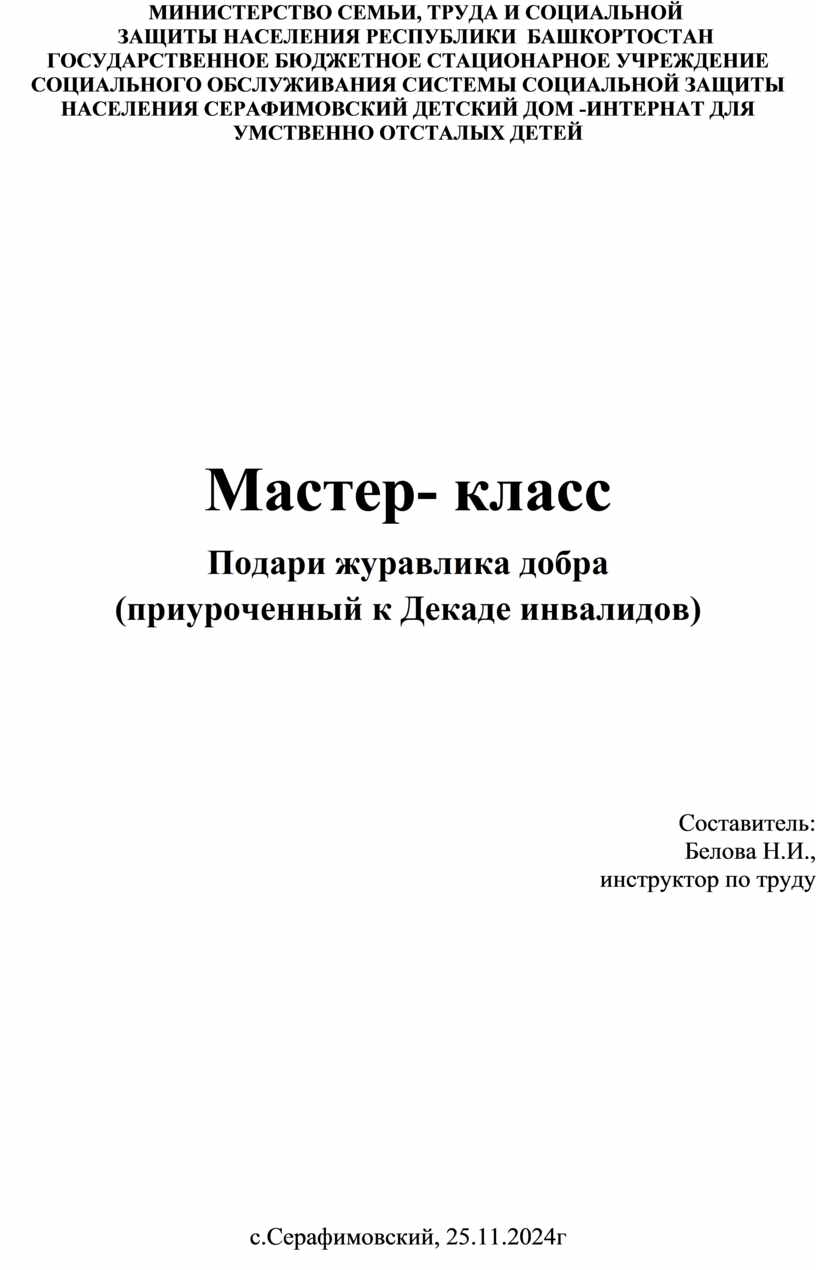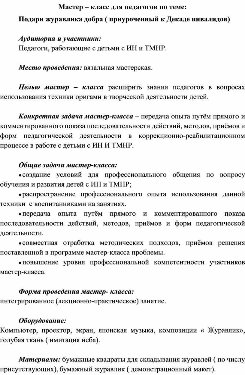 Тема мастер-класса : Подари журавлика добра ( приуроченный к Декаде инвалидов)