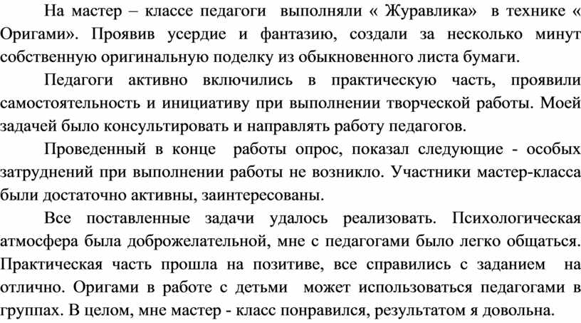 Все поставленные задачи удалось реализовать. Психологическая атмосфера была доброжелательной, мне с педагогами было легко общаться. Практическая часть прошла на позитиве, все справились с заданием на отлично. Оригами в работе с детьми может использоваться педагогами в группах. В целом, мне мастер - класс понравился, результатом я довольна.