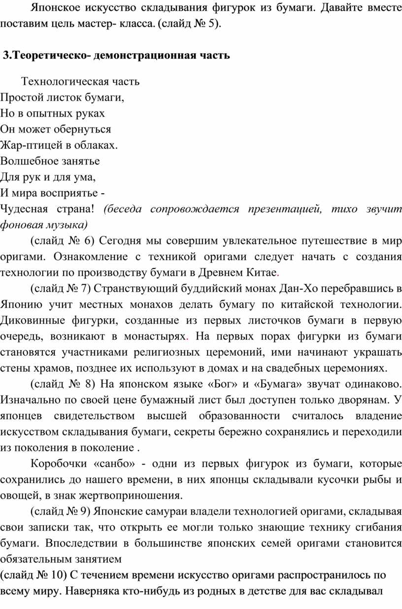 (слайд № 6) Сегодня мы совершим увлекательное путешествие в мир оригами. Ознакомление с техникой оригами следует начать с создания технологии по производству бумаги в Древнем Китае.