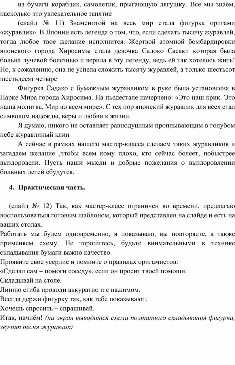 А сейчас в рамках нашего мастер-класса сделаем таких журавликов и загадаем желание ,чтобы всем кому плохо, кто сейчас болеет, побыстрее выздоровели. Пусть наши мысли и добрые пожелания о выздоровлении больных детей сбудутся.