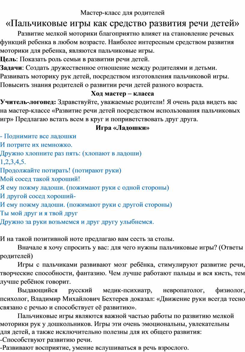 Учитель-логопед: Здравствуйте, уважаемые родители! Я очень рада видеть вас на мастер-классе «Развитие речи детей посредством использования пальчиковых игр» Предлагаю встать всем в круг и поприветствовать друг друга.