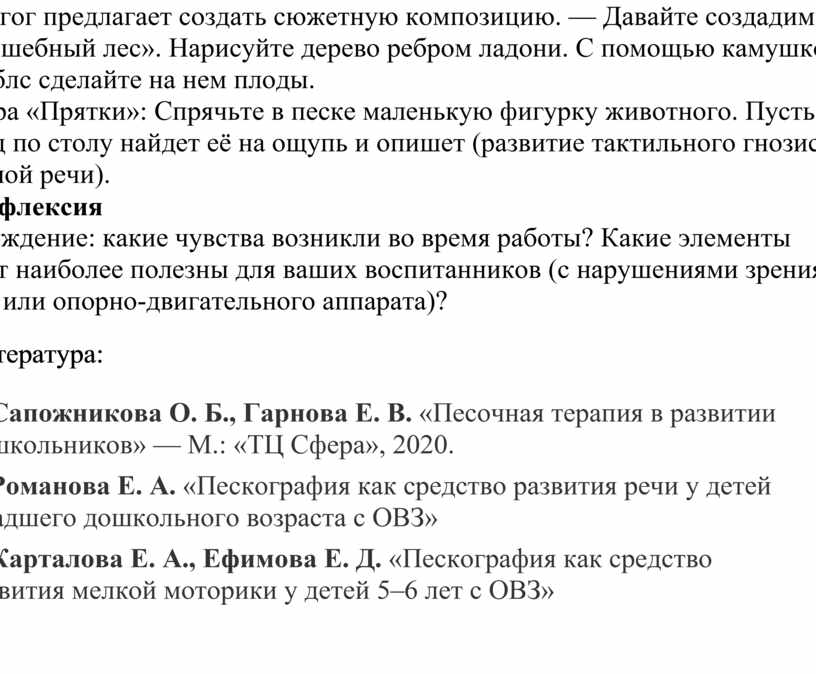 1. Сапожникова О. Б., Гарнова Е. В. «Песочная терапия в развитии дошкольников» — М.: «ТЦ Сфера», 2020.