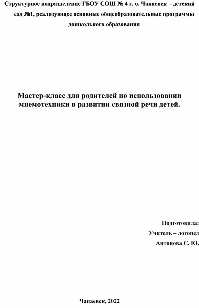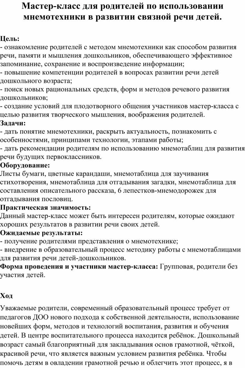 Мастер-класс для родителей по использовании мнемотехники в развитии связной речи детей.