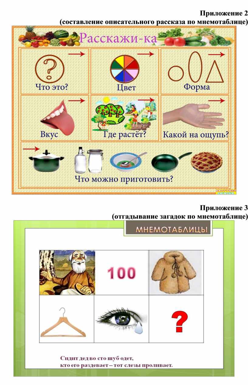 (родители по мнемотаблице описывают и отгадывают фрукты и овощи) (приложение