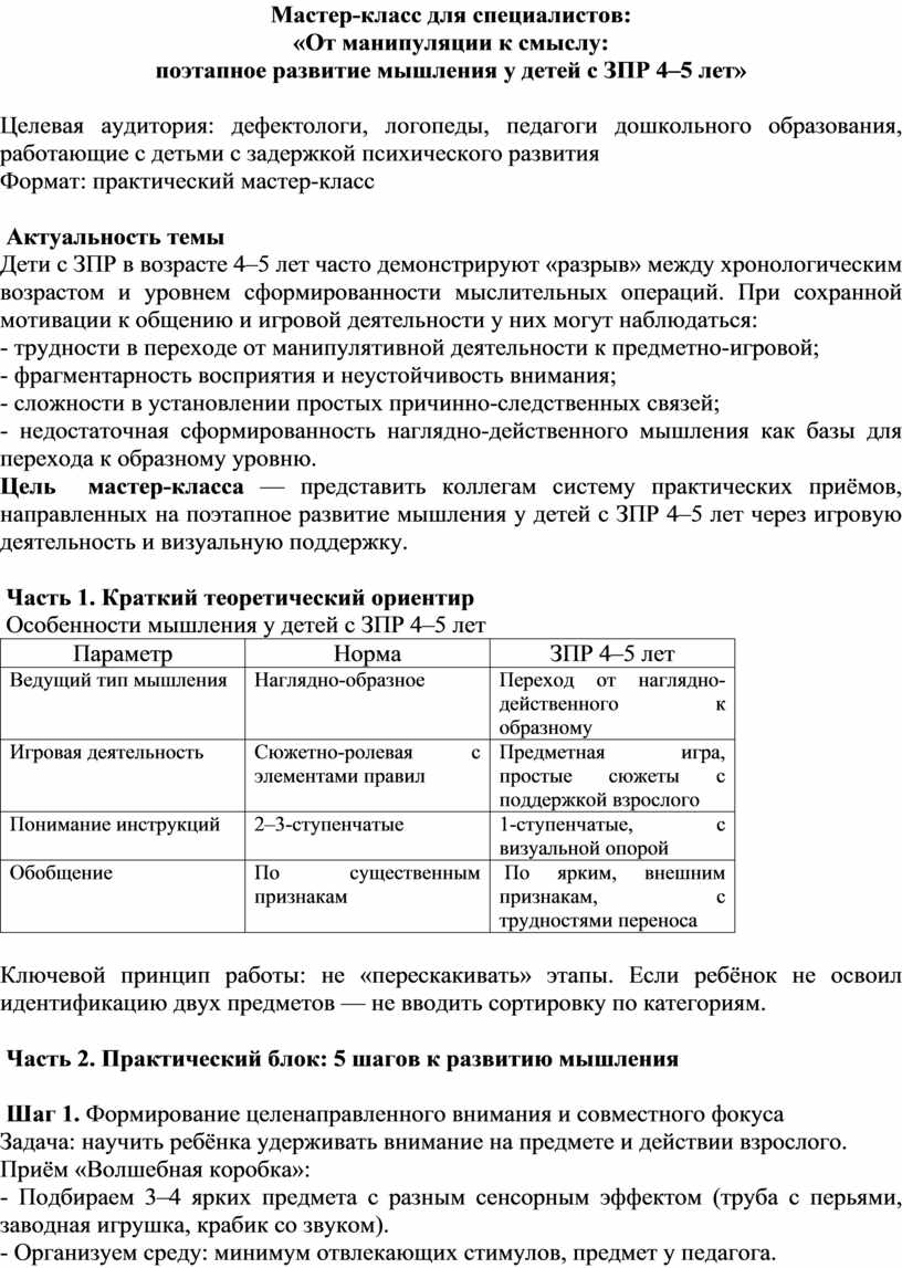 Цель мастер-класса — представить коллегам систему практических приёмов, направленных на поэтапное развитие мышления у детей с ЗПР 4–5 лет через игровую деятельность и визуальную поддержку.