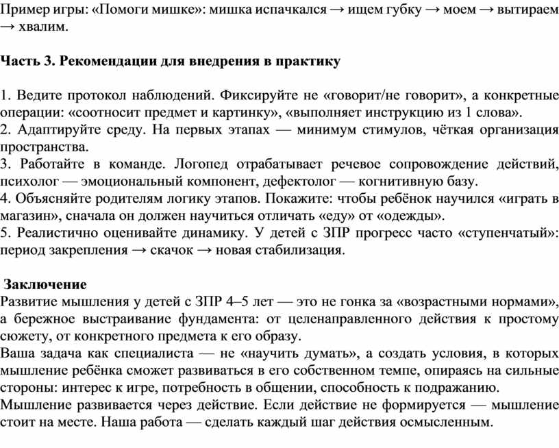 Ваша задача как специалиста — не «научить думать», а создать условия, в которых мышление ребёнка сможет развиваться в его собственном темпе, опираясь на сильные стороны: интерес к игре, потребность в общении, способность к подражанию.