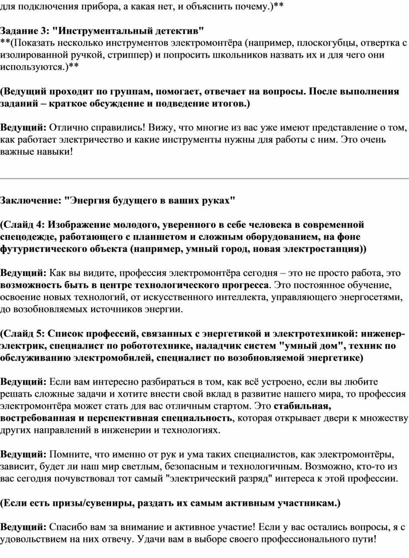 Ведущий: Отлично справились! Вижу, что многие из вас уже имеют представление о том, как работает электричество и какие инструменты нужны для работы с ним. Это очень важные навыки!