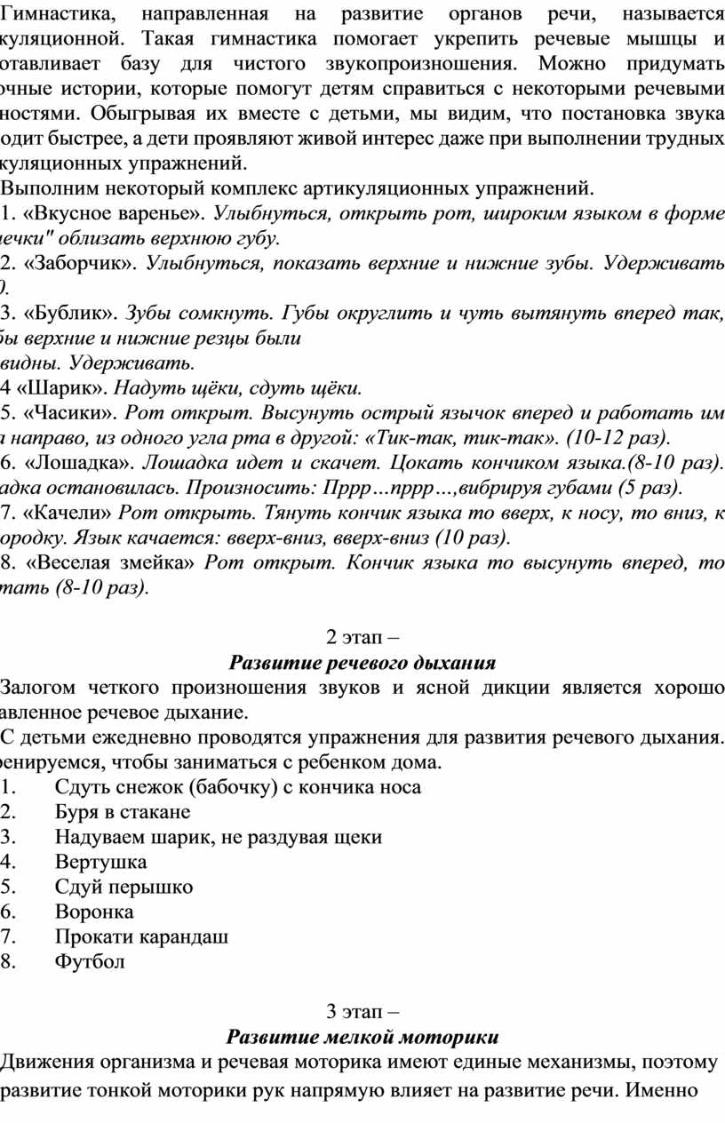 Гимнастика, направленная на развитие органов речи, называется артикуляционной. Такая гимнастика помогает укрепить речевые мышцы и подготавливает базу для чистого звукопроизношения. Можно придумать сказочные истории, которые помогут детям справиться с некоторыми речевыми трудностями. Обыгрывая их вместе с детьми, мы видим, что постановка звука проходит быстрее, а дети проявляют живой интерес даже при выполнении трудных артикуляционных упражнений.