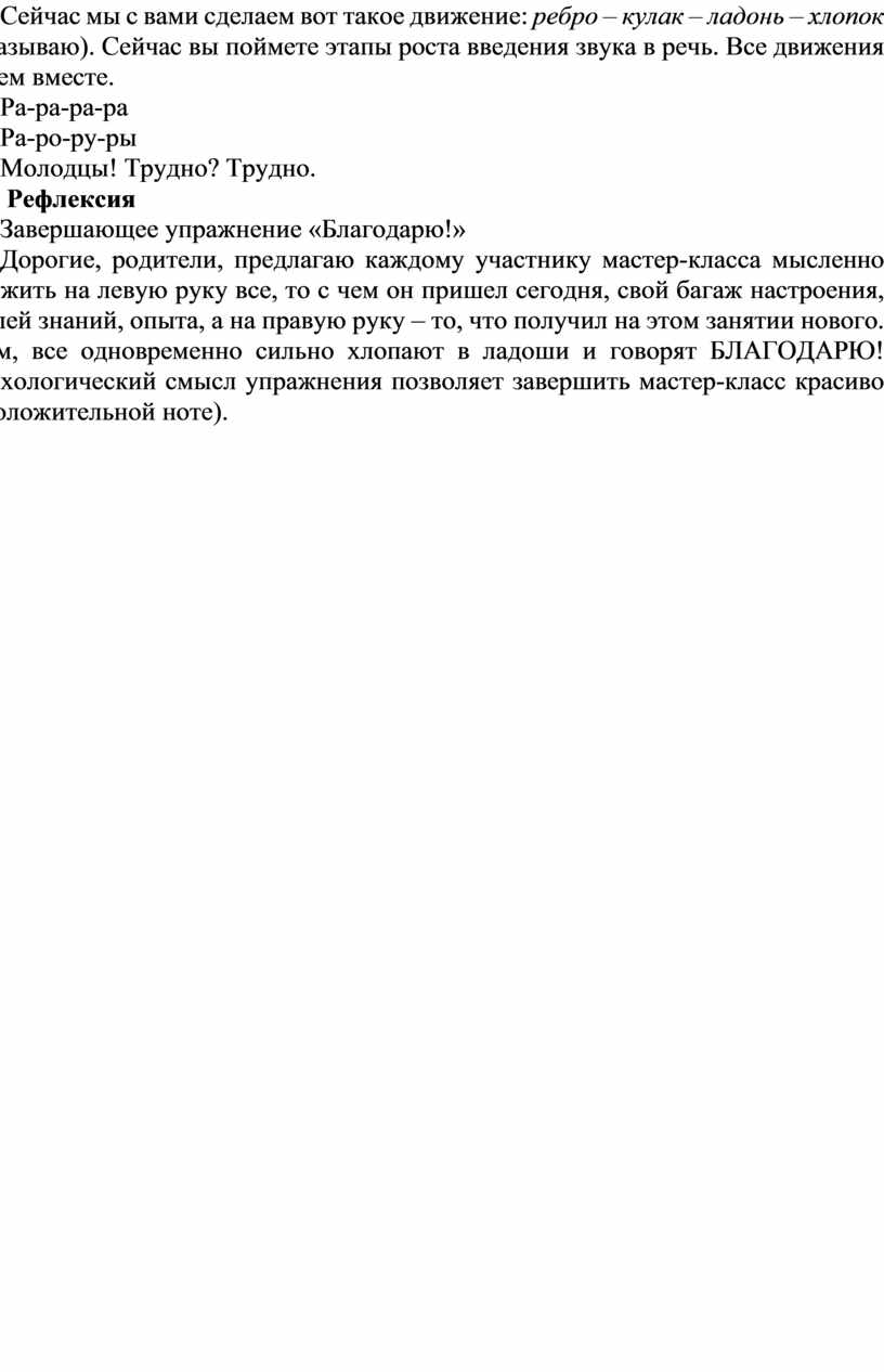 Дорогие, родители, предлагаю каждому участнику мастер-класса мысленно положить на левую руку все, то с чем он пришел сегодня, свой багаж настроения, мыслей знаний, опыта, а на правую руку – то, что получил на этом занятии нового. Затем, все одновременно сильно хлопают в ладоши и говорят БЛАГОДАРЮ! (Психологический смысл упражнения позволяет завершить мастер-класс красиво на положительной ноте).