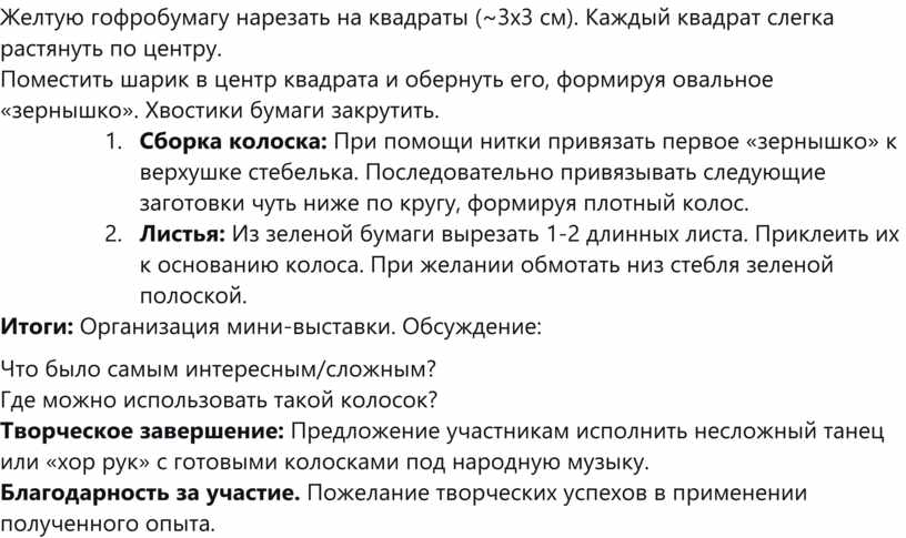Практическая значимость: Технология проста, безопасна и увлекательна для детей. Готовые колоски могут быть использованы: