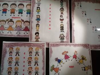 Далее эти статичные модели трансформируются в подгрупповые. Сначала идет показ модели. Далее, звучит вступление на песню, и дети самостоятельно занимают места. (Соблюдая 2 правила). Эти модели также потом используются в течение года с постепенным усложнением. Можно добавлять и соревновательный момент – «чья группа красивее и быстрее займет место».