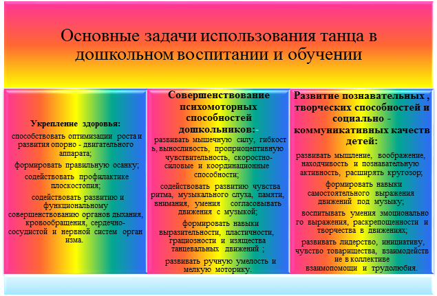 Танец – это мир красоты, движения, звуков, световых красок, костюмов, мир волшебного искусства. Занятия танцем способствуют физическому развитию детей, формируют правильную осанку, обогащают духовно, прививают основы этикета и грамотной манеры поведения в обществе, дают представление об актерском мастерстве. Танец является богатейшим источником эстетических впечатлений ребенка, его творческих возможностей.
