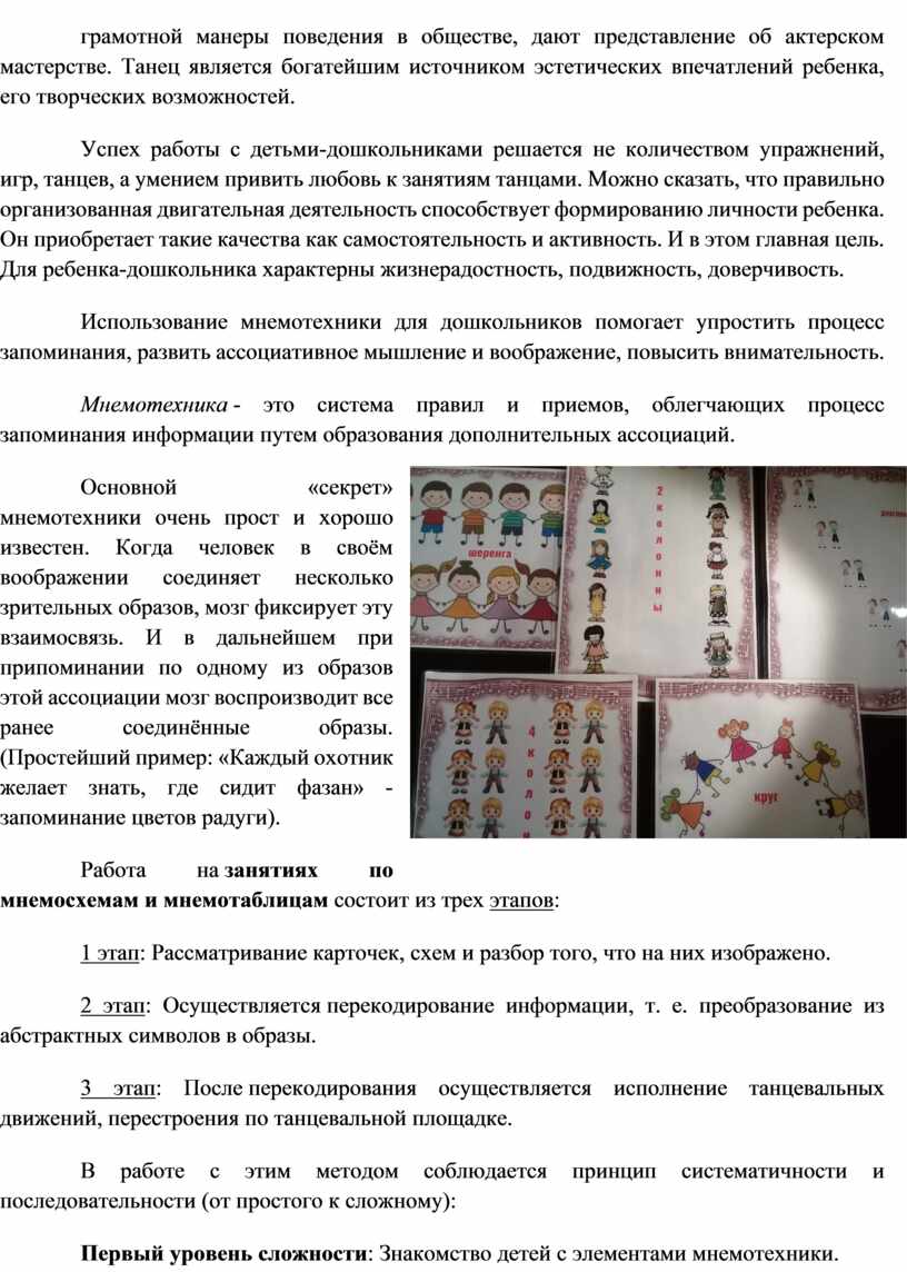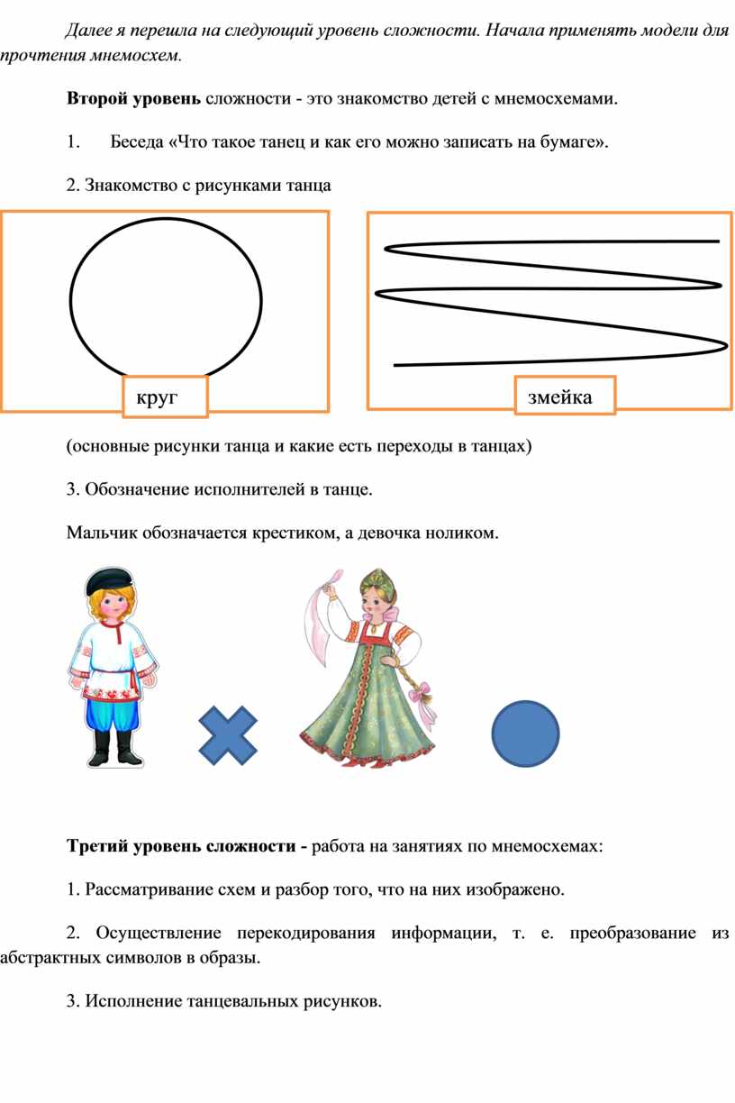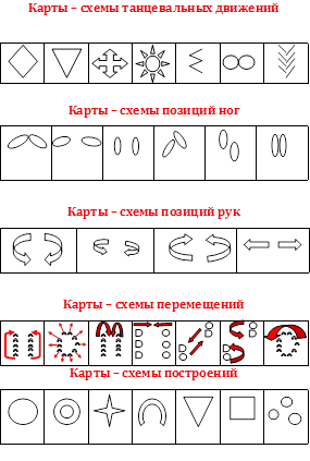 На занятиях огромное время тратится на запоминание танца. Ребёнок должен выучить все танцевальные движения и запомнить все перемещения. Использование мнемосхем и мнемотаблиц облегчает этот процесс. Данный метод в моей работе эффективно зарекомендовал себя при разучивании танцев на занятиях. Суть заключается в следующем: на каждую смену музыкальной фразы, танцевальных движений придумывается картинка (изображение, таким образом, весь танец зарисовывается схематически. После этого ребенок по памяти, по принципу «от простого к сложному», используя графическое изображение, воспроизводит танец целиком.