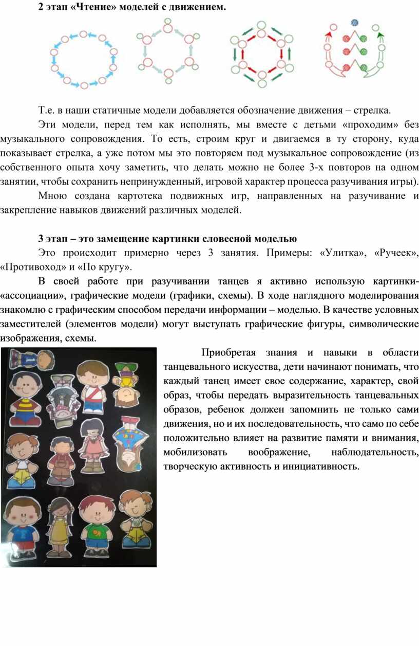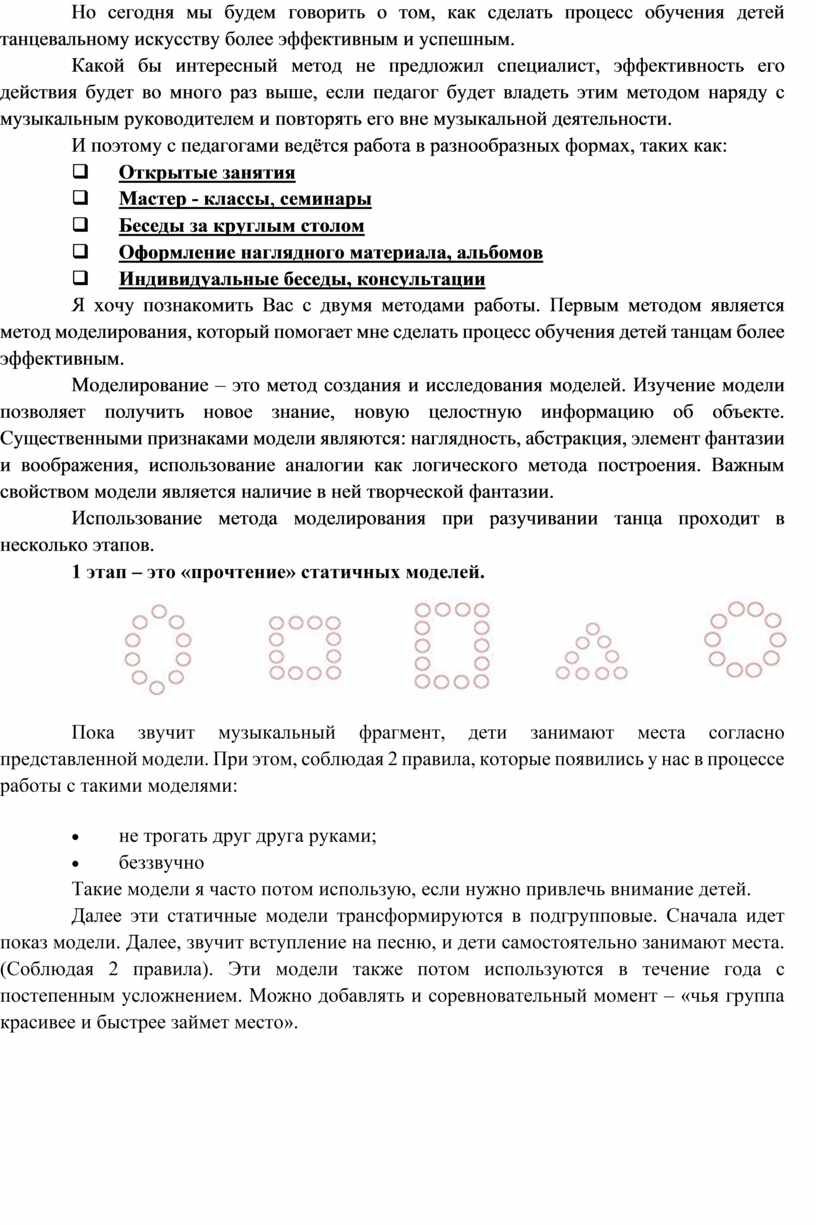 Я хочу познакомить Вас с двумя методами работы. Первым методом является метод моделирования, который помогает мне сделать процесс обучения детей танцам более эффективным.