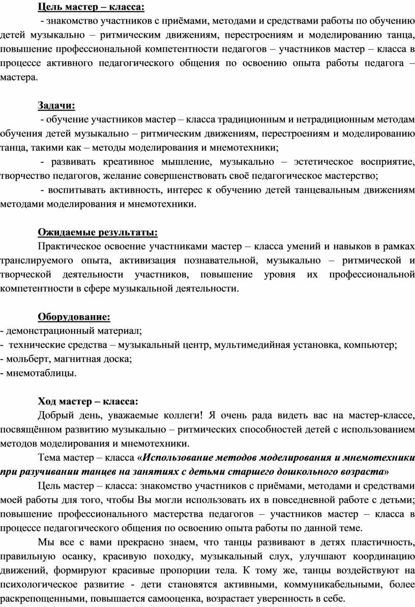 - обучение участников мастер – класса традиционным и нетрадиционным методам обучения детей музыкально – ритмическим движениям, перестроениям и моделированию танца, такими как – методы моделирования и мнемотехники;