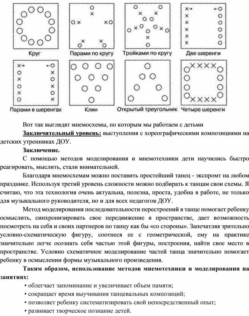 Метод моделирования последовательности перестроений в танце помогает ребенку осмыслить, синхронизировать свое передвижение в пространстве, дает возможность посмотреть на себя и своих партнеров по танцу как бы «со стороны». Запечатляя зрительно условно-схематическую фигуру, соотнеся ее с геометрической, ему на практике значительно легче осознать себя частью этой фигуры, построения, найти свое место в пространстве. Условно схематичное моделирование частей танца значительно помогает ребенку в осмыслении формы музыкального произведения.