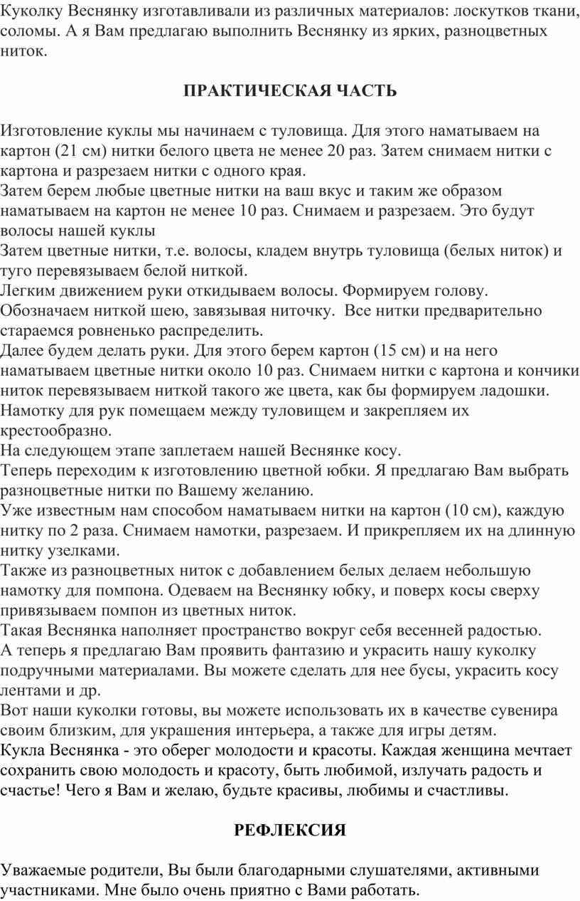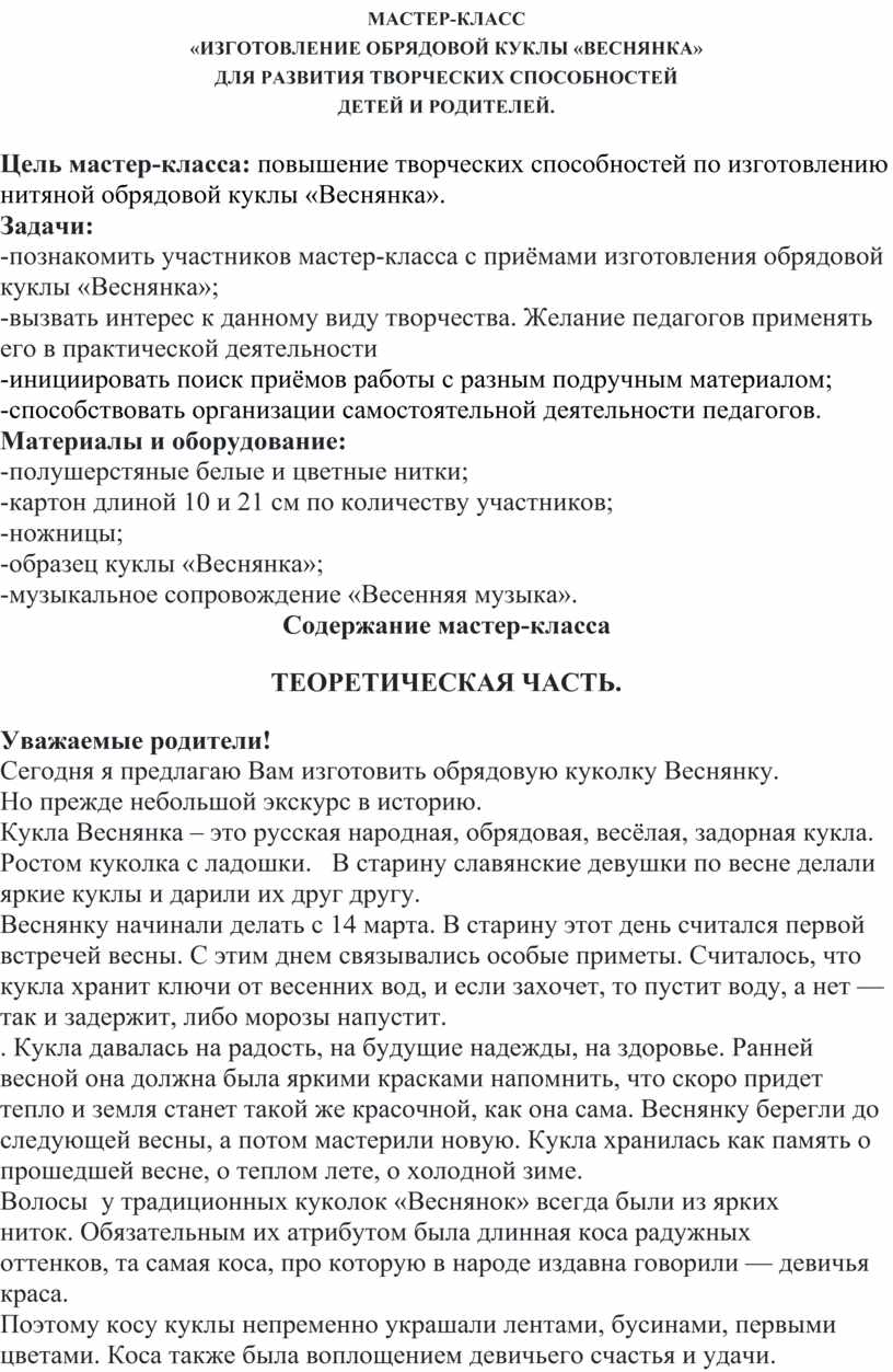 Цель мастер-класса: повышение творческих способностей по изготовлению нитяной обрядовой куклы «Веснянка».