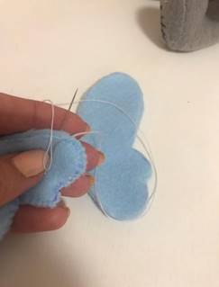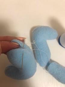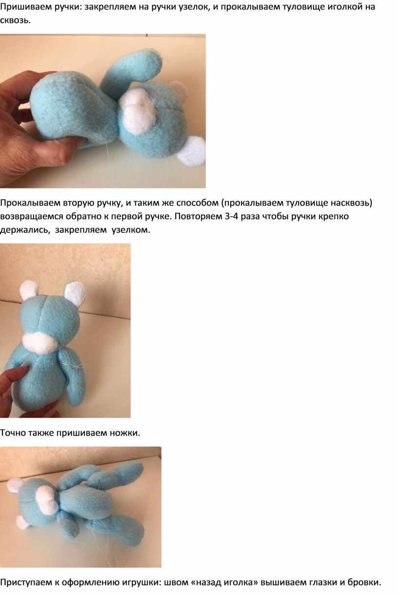 Пришиваем ручки: закрепляем на ручки узелок, и прокалываем туловище иголкой на сквозь.