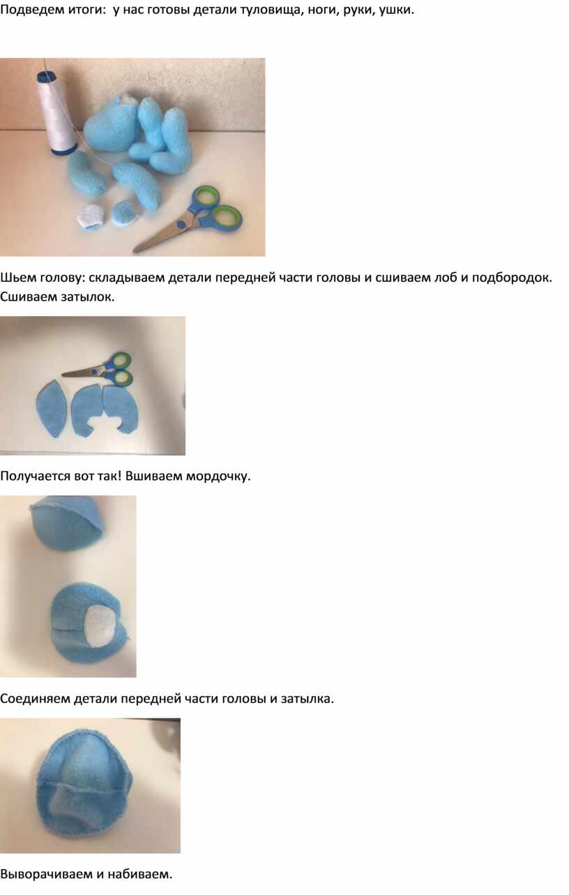Шьем голову: складываем детали передней части головы и сшиваем лоб и подбородок. Сшиваем затылок.