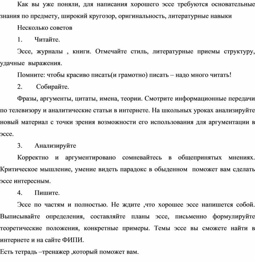 Эссе по частям и полностью. Не ждите ,что хорошее эссе напишется собой. Выписывайте определения, составляйте планы эссе, письменно формулируйте теоретические положения, конкретные примеры. Темы эссе вы сможете найти в интернете и на сайте ФИПИ.