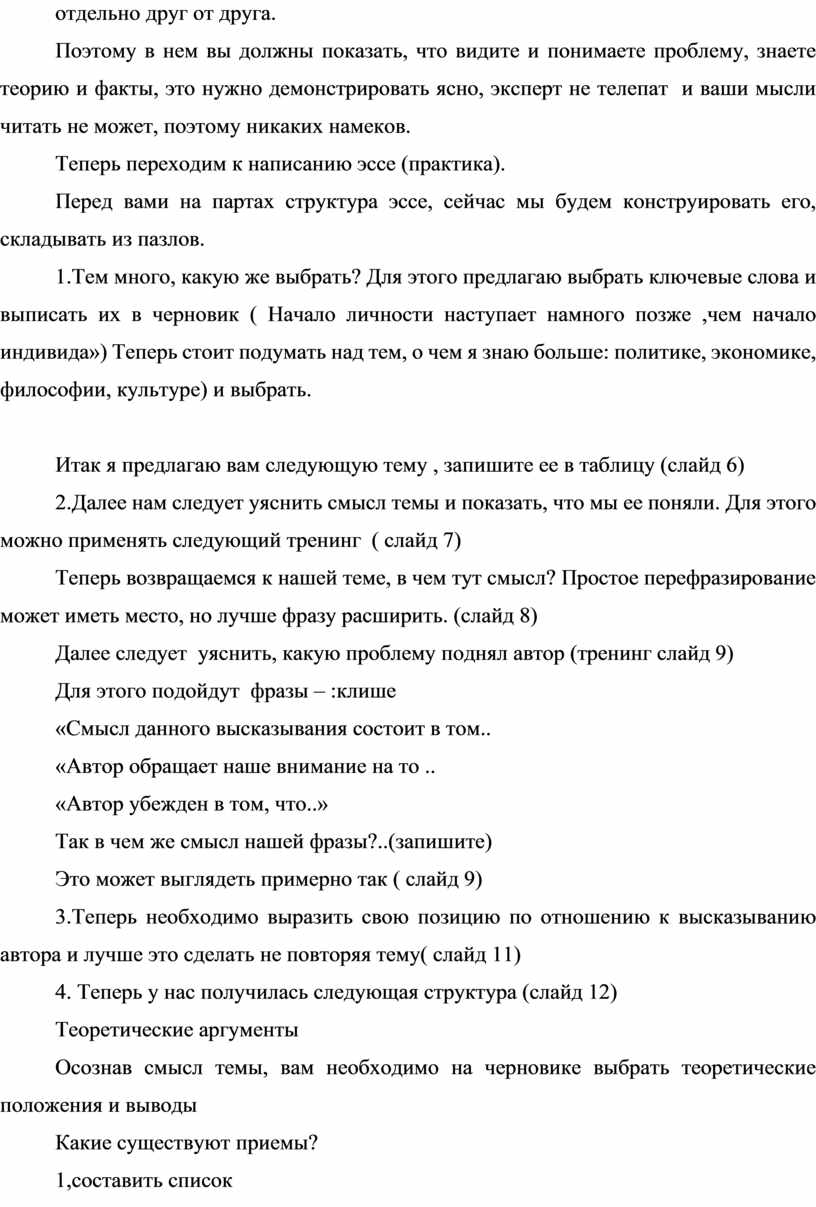 Перед вами на партах структура эссе, сейчас мы будем конструировать его, складывать из пазлов.
