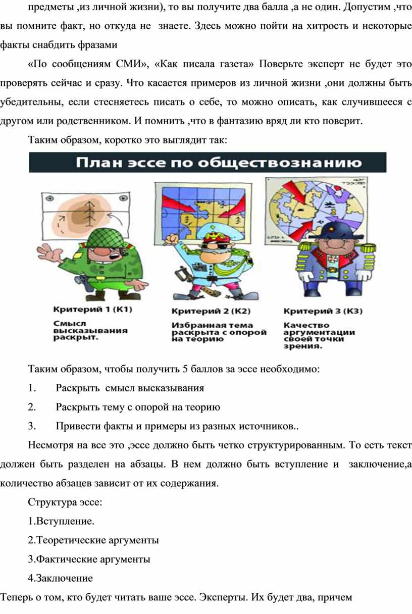 К3-факты и примеры, подтверждающие ваши аргументы в эссе.(между прочим он подразумевает ,что вы должны высказать вашу точку зрения на тему – вот только баллы за это уже не дают ).Однако ,если они из разных источников(СМИ, учебные предметы ,из личной жизни), то вы получите два балла ,а не один. Допустим ,что вы помните факт, но откуда не знаете. Здесь можно пойти на хитрость и некоторые факты снабдить фразами
