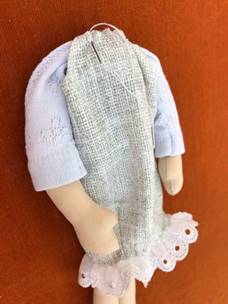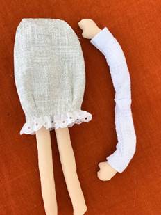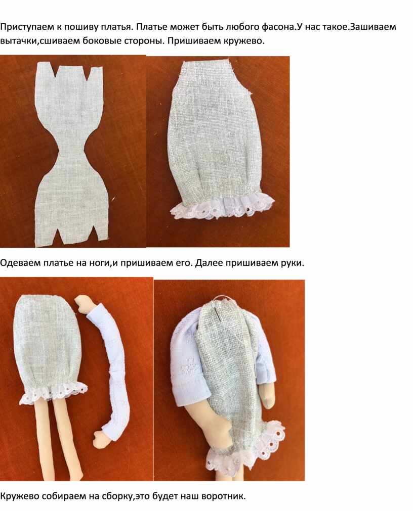 Одеваем платье на ноги,и пришиваем его. Далее пришиваем руки.