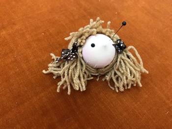 Для глазок нам понадобится булавки с бусинами , красим их в черный цвет акриловой краской.Намечаем на лице место расположения глазок и приклеиваем.