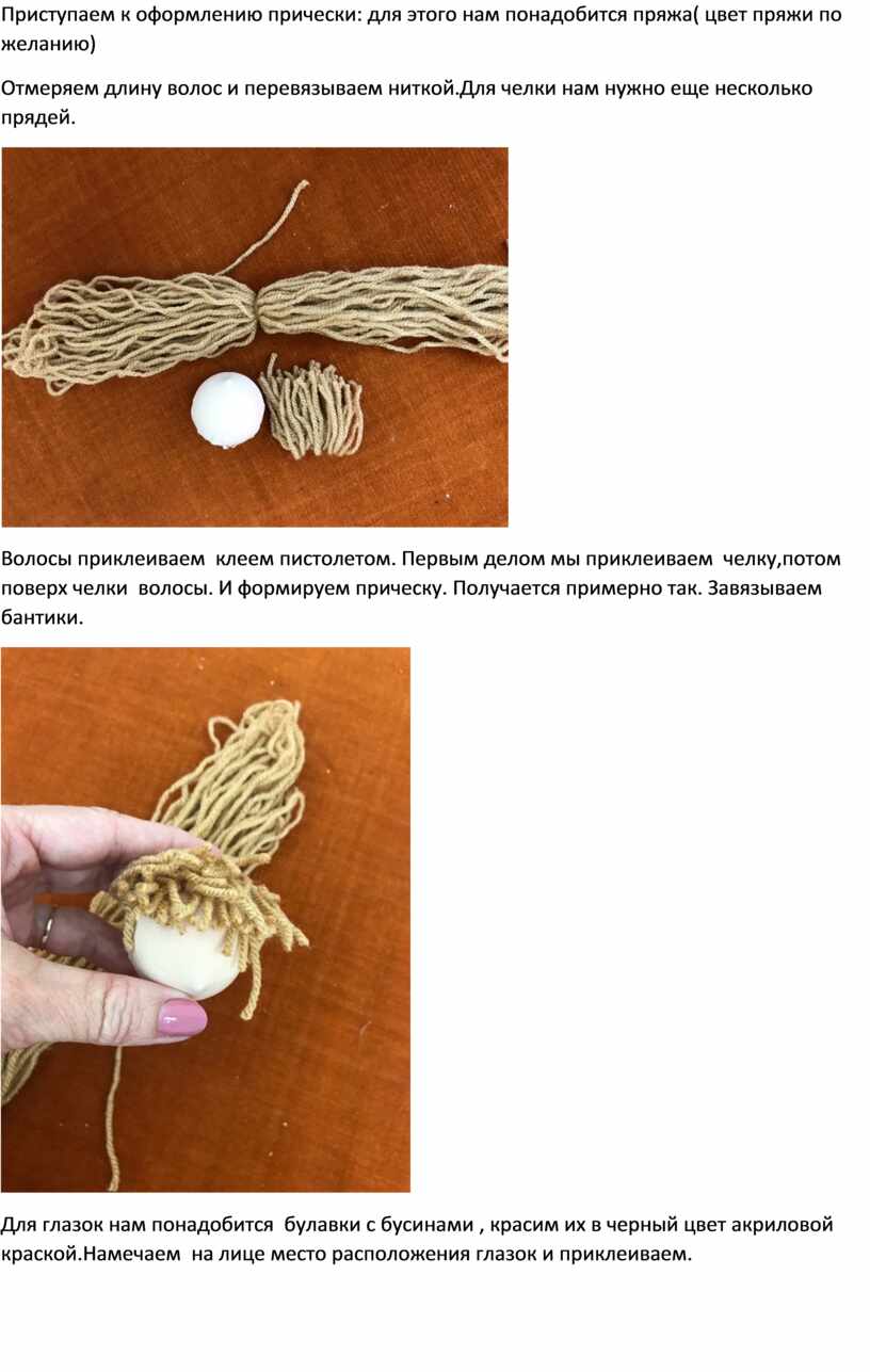 Приступаем к оформлению прически: для этого нам понадобится пряжа( цвет пряжи по желанию)