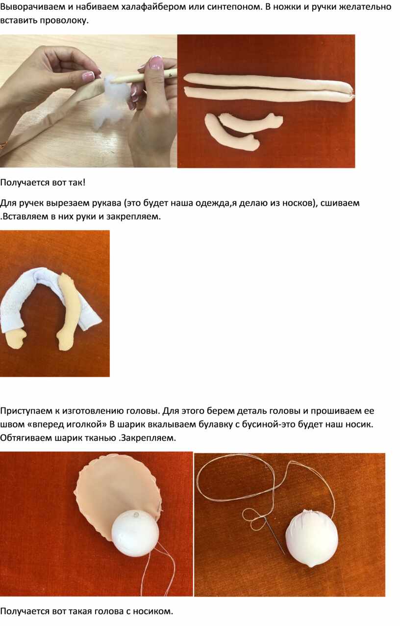 Для ручек вырезаем рукава (это будет наша одежда,я делаю из носков), сшиваем .Вставляем в них руки и закрепляем.
