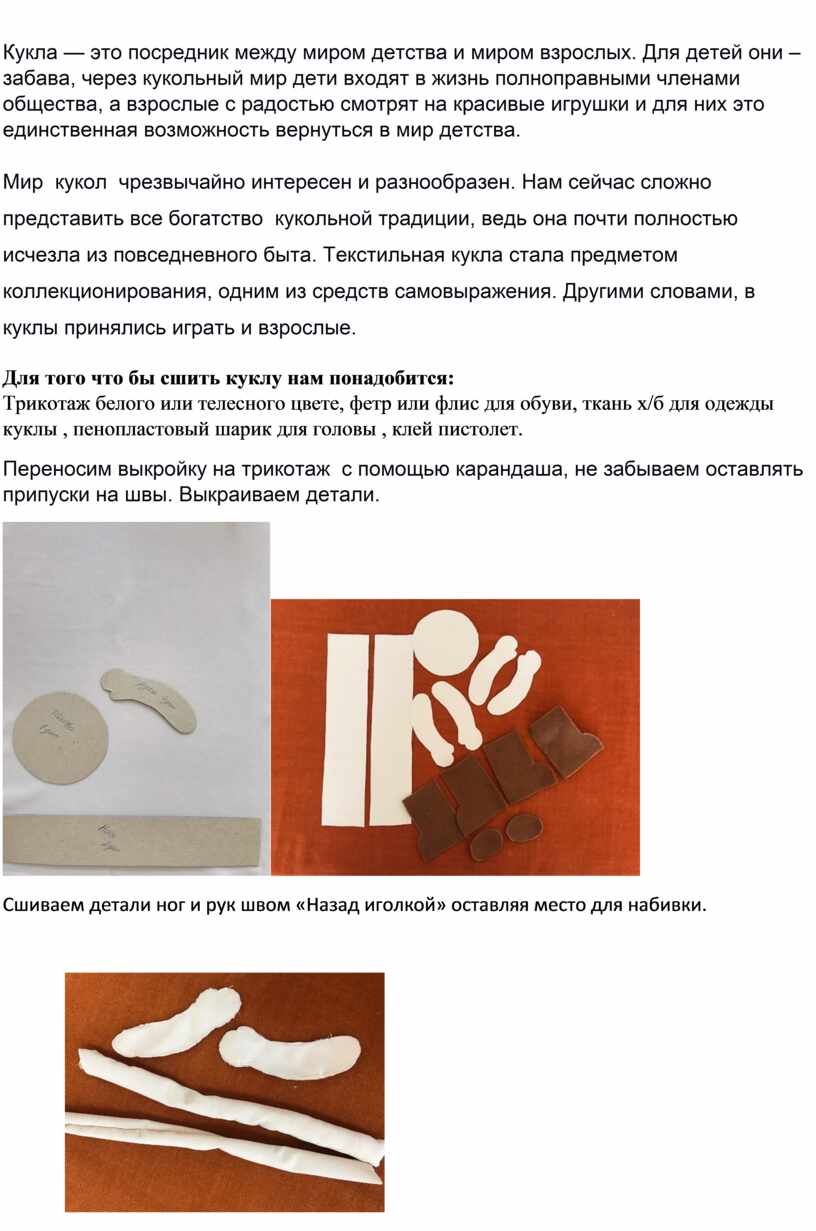 Для того что бы сшить куклу нам понадобится: Трикотаж белого или телесного цвете, фетр или флис для обуви, ткань х/б для одежды куклы , пенопластовый шарик для головы , клей пистолет.