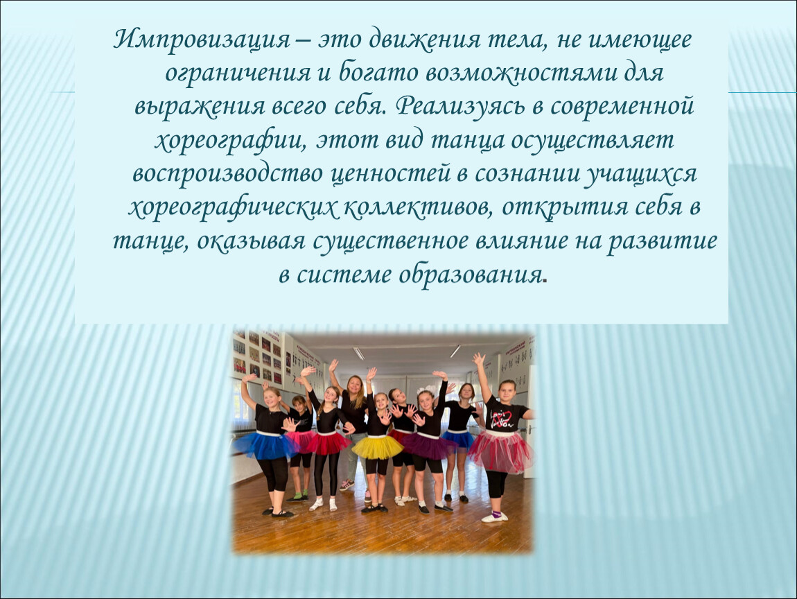 Импровизация – это движения тела, не имеющее ограничения и богато возможностями для выражения всего себя. Реализуясь в современной хореографии, этот вид танца осуществляет воспроизводство ценностей в сознании учащихся хореографических коллективов, открытия себя в танце, оказывая существенное влияние на развитие в системе образования.