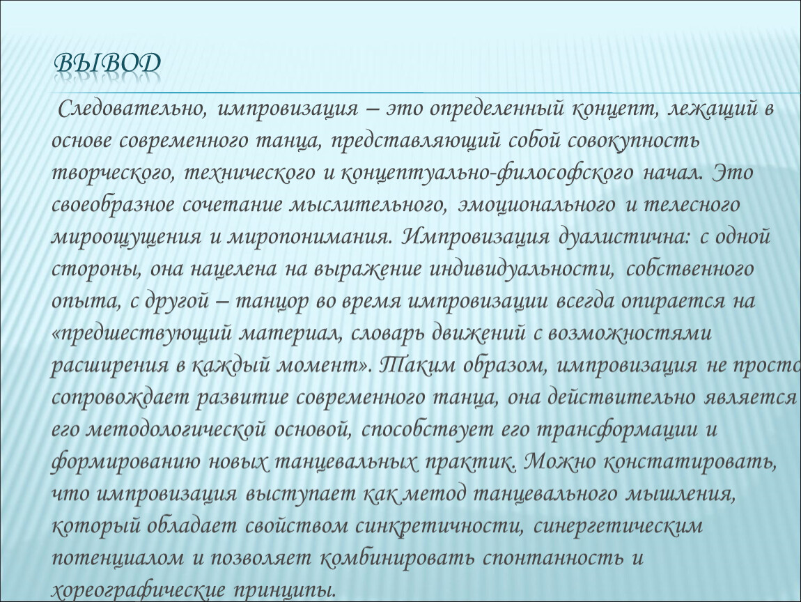 Следовательно, импровизация – это определенный концепт, лежащий в основе современного танца, представляющий собой совокупность творческого, технического и концептуально-философского начал. Это своеобразное сочетание мыслительного, эмоционального и телесного мироощущения и миропонимания. Импровизация дуалистична: с одной стороны, она нацелена на выражение индивидуальности, собственного опыта, с другой – танцор во время импровизации всегда опирается на «предшествующий материал, словарь движений с возможностями расширения в каждый момент». Таким образом, импровизация не просто сопровождает развитие современного танца, она действительно является его методологической основой, способствует его трансформации и формированию новых танцевальных практик. Можно констатировать, что импровизация выступает как метод танцевального мышления, который обладает свойством синкретичности, синергетическим потенциалом и позволяет комбинировать спонтанность и хореографические принципы.