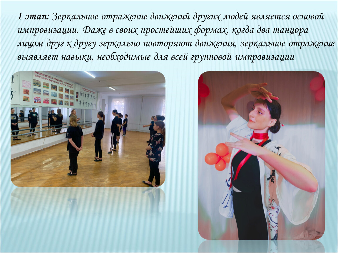 1 этап: Зеркальное отражение движений других людей является основой импровизации. Даже в своих простейших формах, когда два танцора лицом друг к другу зеркально повторяют движения, зеркальное отражение выявляет навыки, необходимые для всей групповой импровизации