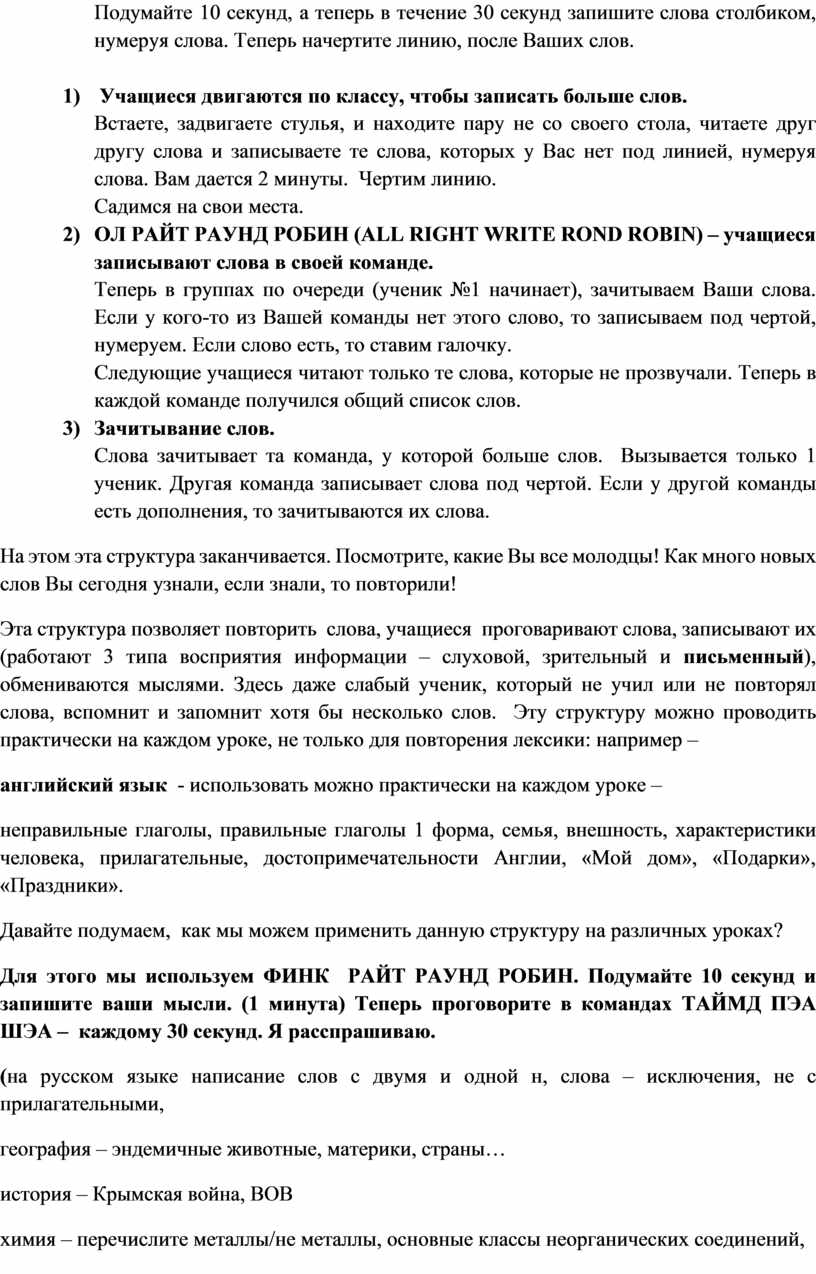 Эта структура позволяет повторить слова, учащиеся проговаривают слова, записывают их (работают 3 типа восприятия информации – слуховой, зрительный и письменный), обмениваются мыслями. Здесь даже слабый ученик, который не учил или не повторял слова, вспомнит и запомнит хотя бы несколько слов. Эту структуру можно проводить практически на каждом уроке, не только для повторения лексики: например –