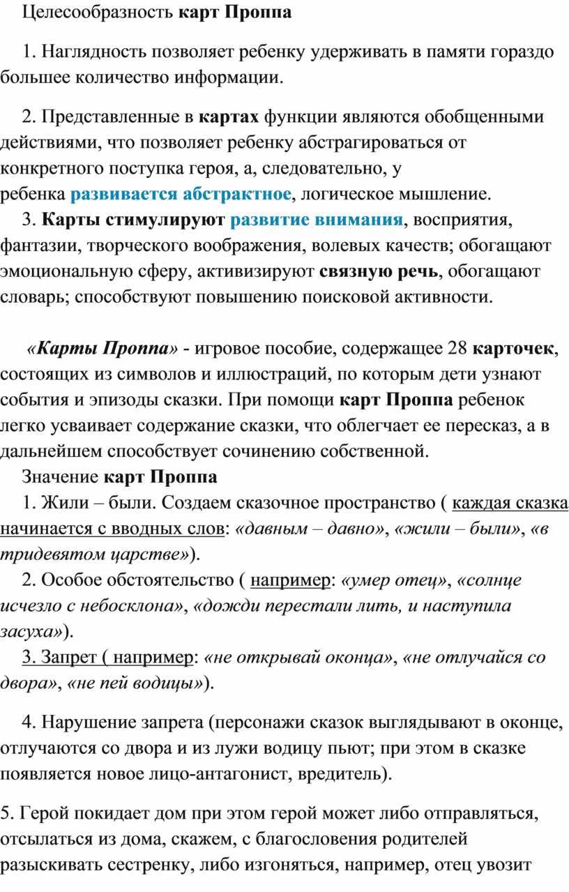 «Карты Проппа» - игровое пособие, содержащее 28 карточек, состоящих из символов и иллюстраций, по которым дети узнают события и эпизоды сказки. При помощи карт Проппа ребенок легко усваивает содержание сказки, что облегчает ее пересказ, а в дальнейшем способствует сочинению собственной.