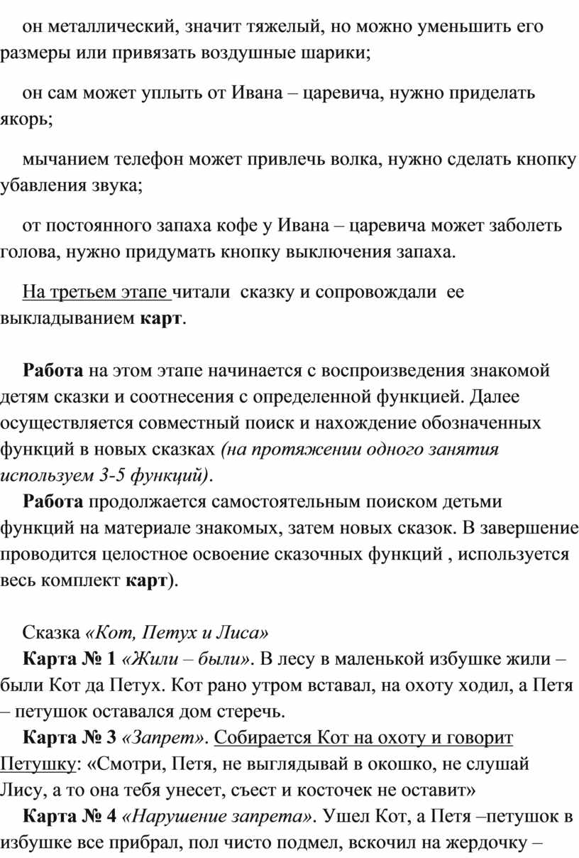 Работа продолжается самостоятельным поиском детьми функций на материале знакомых, затем новых сказок. В завершение проводится целостное освоение сказочных функций , используется весь комплект карт).