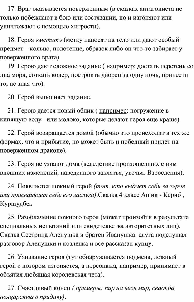 25. Разоблачение ложного героя (может произойти в результате специальных испытаний или свидетельства авторитетных лиц). Сказка Сестрица Аленушка и братец Иванушка: слуга подслушал разговор Аленушки и козленка и все рассказал купцу.