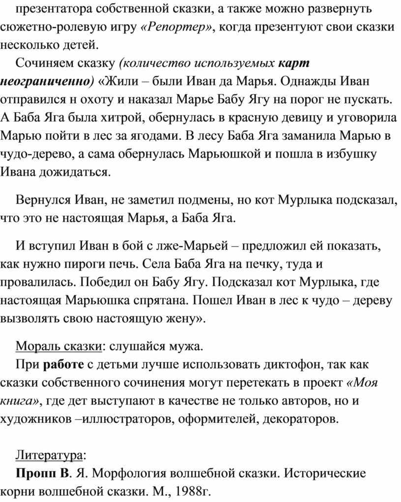 Сочиняем сказку (количество используемых карт неограниченно) «Жили – были Иван да Марья. Однажды Иван отправился н охоту и наказал Марье Бабу Ягу на порог не пускать. А Баба Яга была хитрой, обернулась в красную девицу и уговорила Марью пойти в лес за ягодами. В лесу Баба Яга заманила Марью в чудо-дерево, а сама обернулась Марьюшкой и пошла в избушку Ивана дожидаться.