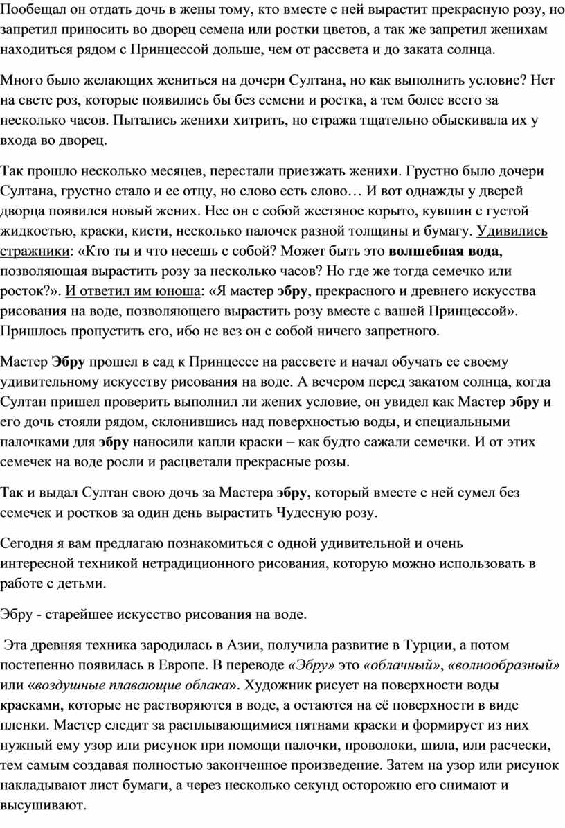 Так прошло несколько месяцев, перестали приезжать женихи. Грустно было дочери Султана, грустно стало и ее отцу, но слово есть слово… И вот однажды у дверей дворца появился новый жених. Нес он с собой жестяное корыто, кувшин с густой жидкостью, краски, кисти, несколько палочек разной толщины и бумагу. Удивились стражники: «Кто ты и что несешь с собой? Может быть это волшебная вода, позволяющая вырастить розу за несколько часов? Но где же тогда семечко или росток?». И ответил им юноша: «Я мастер эбру, прекрасного и древнего искусства рисования на воде, позволяющего вырастить розу вместе с вашей Принцессой». Пришлось пропустить его, ибо не вез он с собой ничего запретного.