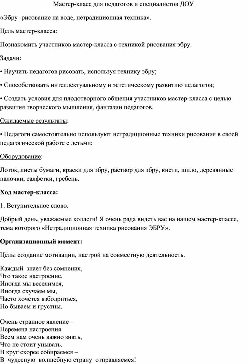 Добрый день, уважаемые коллеги! Я очень рада видеть вас на нашем мастер-классе, тема которого «Нетрадиционная техника рисования ЭБРУ».