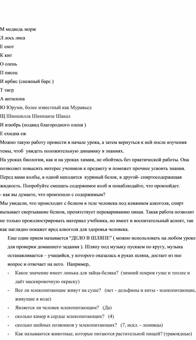 Именно с этой темой и будет связан следующий прием, который называется «АЛФАВИТ» Этот прием можно провести на этапе изучения нового материала или на этапе закрепления. У всех вас есть знания по этой теме (у кого-то в большей, у кого-то в меньшей степени). Я предлагаю составить как можно больше слов, относящихся к этой теме и начинающихся с каждой буквы слова «млекопитающие» После работы вам нужно будет обосновать свой список, показав связь слов с темой.