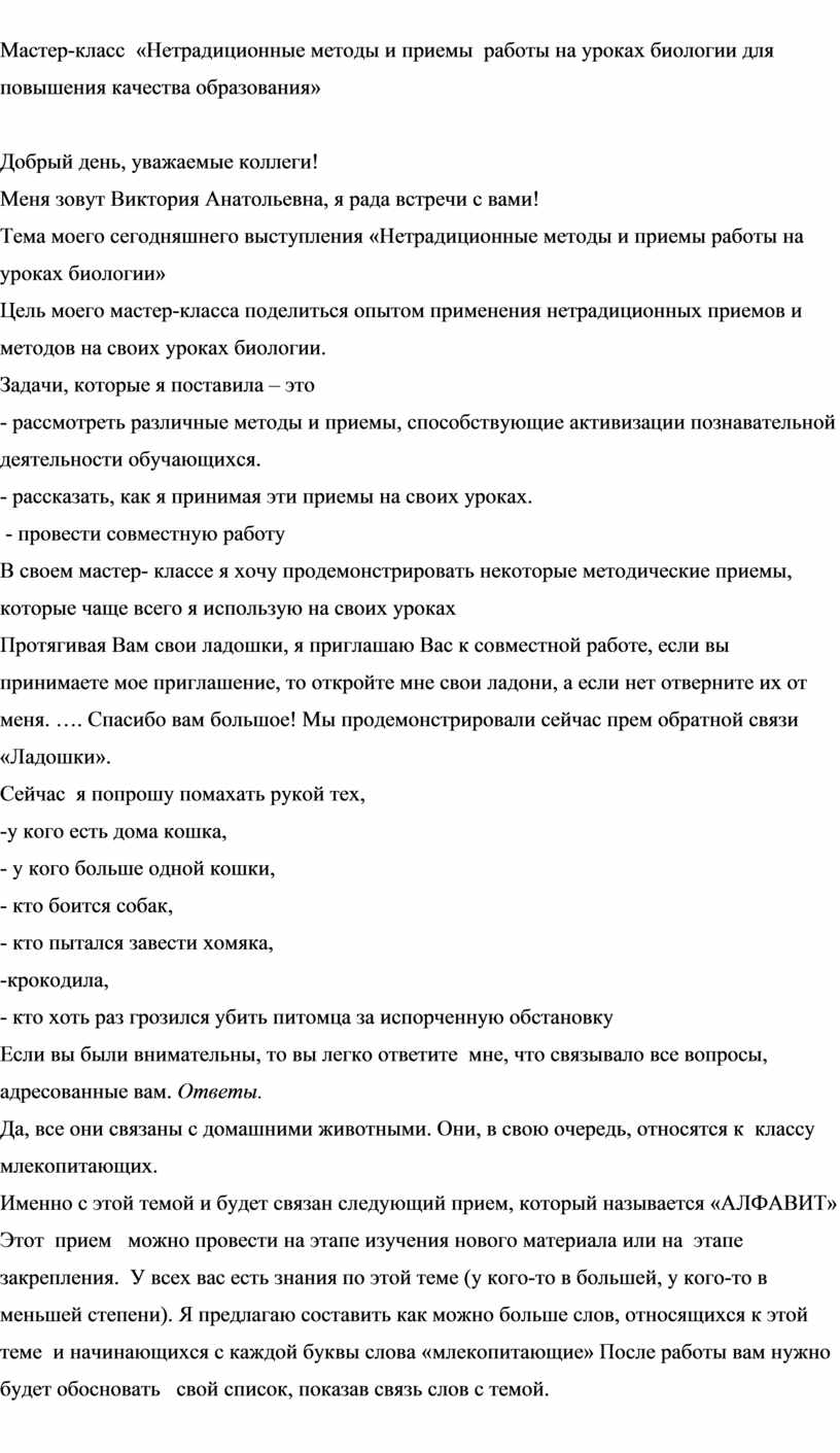 Мастер-класс «Нетрадиционные методы и приемы работы на уроках биологии для повышения качества образования»
