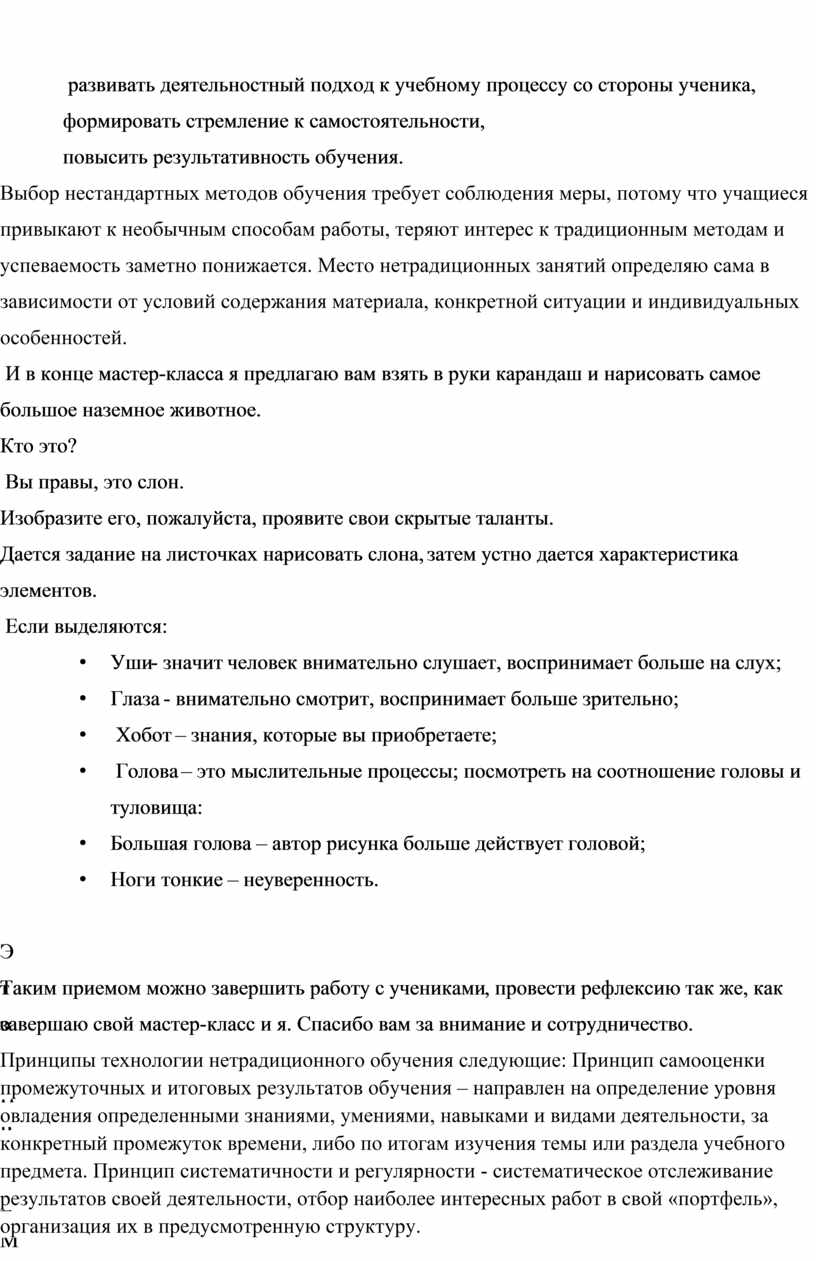 Выбор нестандартных методов обучения требует соблюдения меры, потому что учащиеся привыкают к необычным способам работы, теряют интерес к традиционным методам и успеваемость заметно понижается. Место нетрадиционных занятий определяю сама в зависимости от условий содержания материала, конкретной ситуации и индивидуальных особенностей.