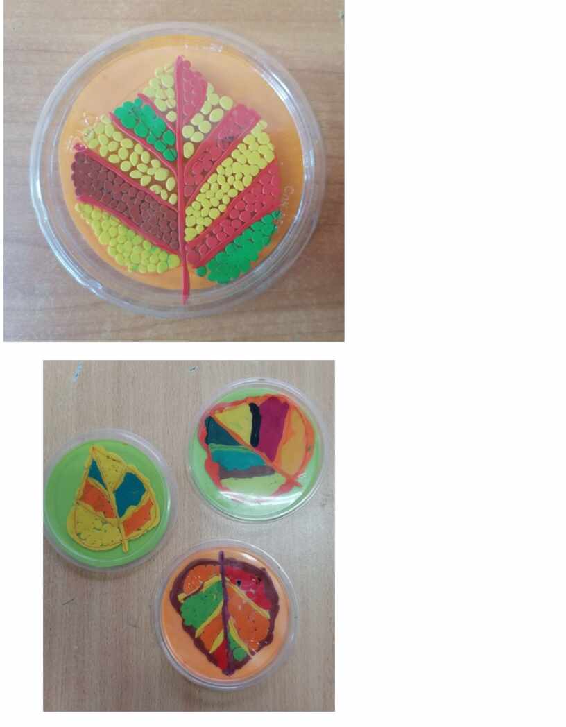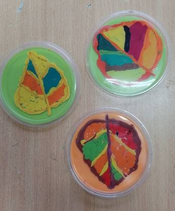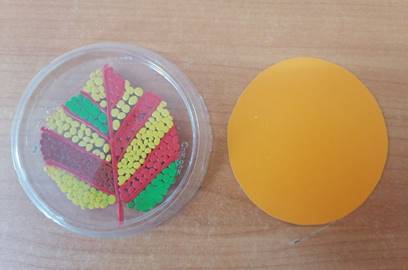 - Сегодня и мы будем художниками. Давайте рассмотрим осенние листочки, которые лежат у вас на столе. Здесь и кленовые, и дубовые. Но посмотрите, листочки не раскрашены надо раскрасить, а раскрашивать мы сегодня будем пластилином. Ребята мы будем «вливать» один цвет в другой. Листики дуба дольше всех остаются зелёными, а потом осень их раскрашивает в золотистый цвет. Кленовые листочки тоже зелёного цвета, но потом начинают золотеть.