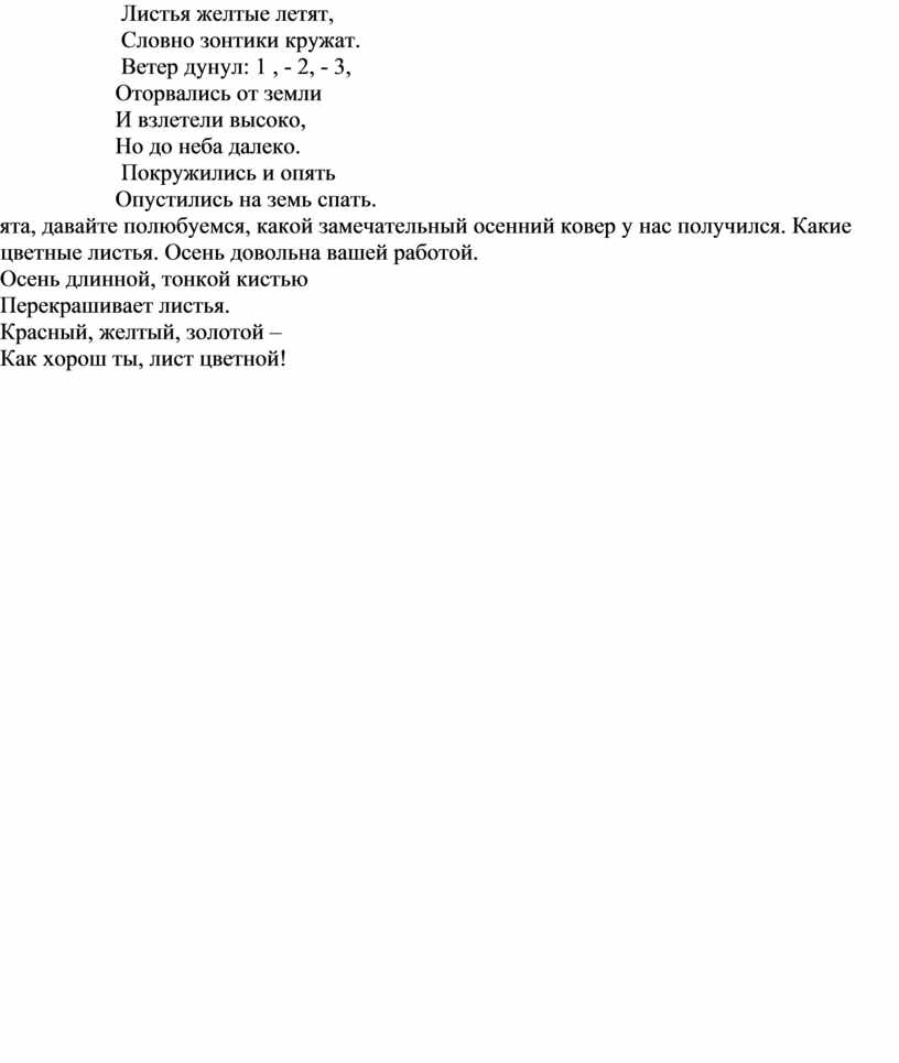 - Ребята, давайте полюбуемся, какой замечательный осенний ковер у нас получился. Какие разноцветные листья. Осень довольна вашей работой.