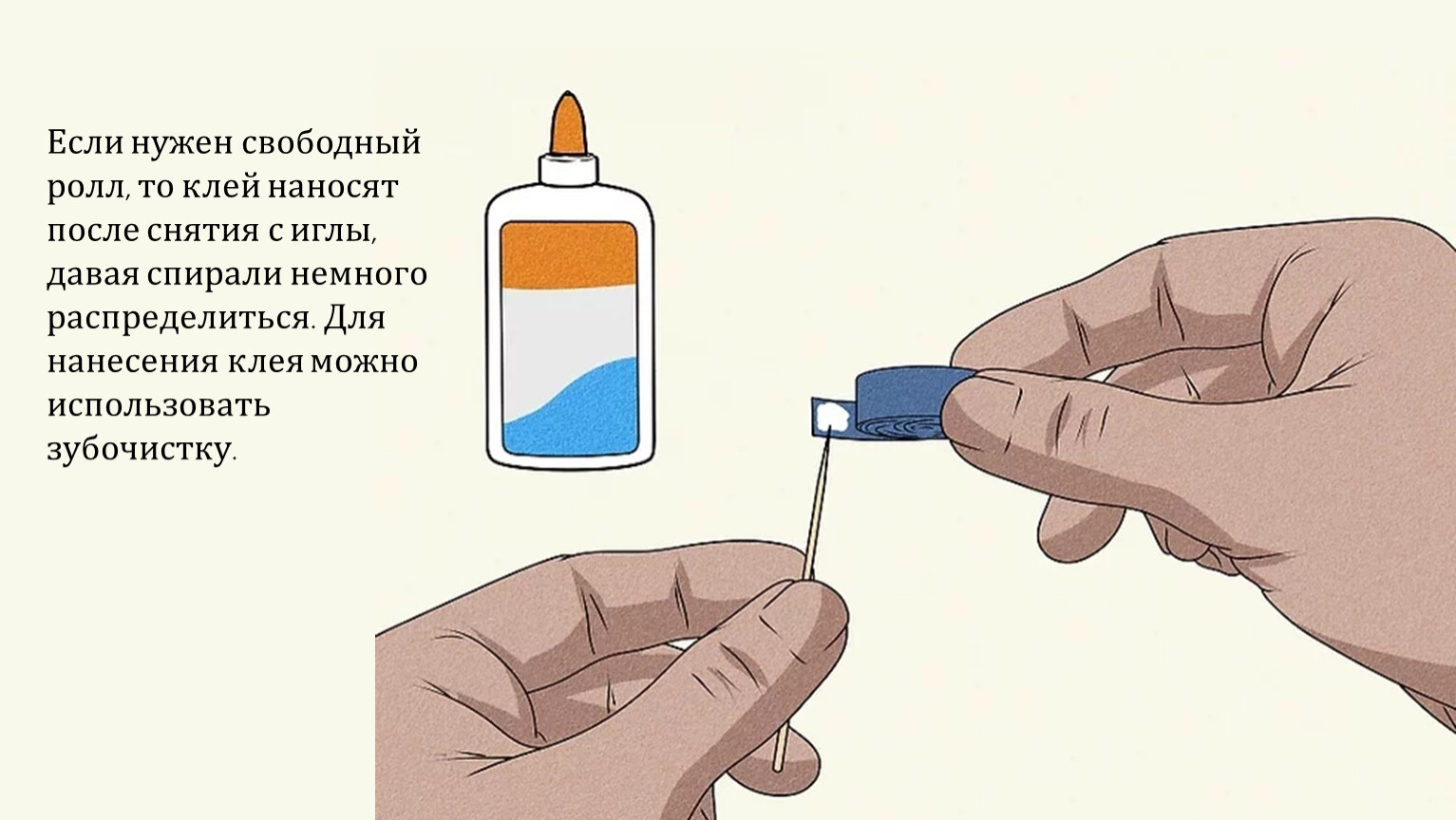 Если нужен свободный ролл, то клей наносят после снятия с иглы, давая спирали немного распределиться. Для нанесения клея можно использовать зубочистку.