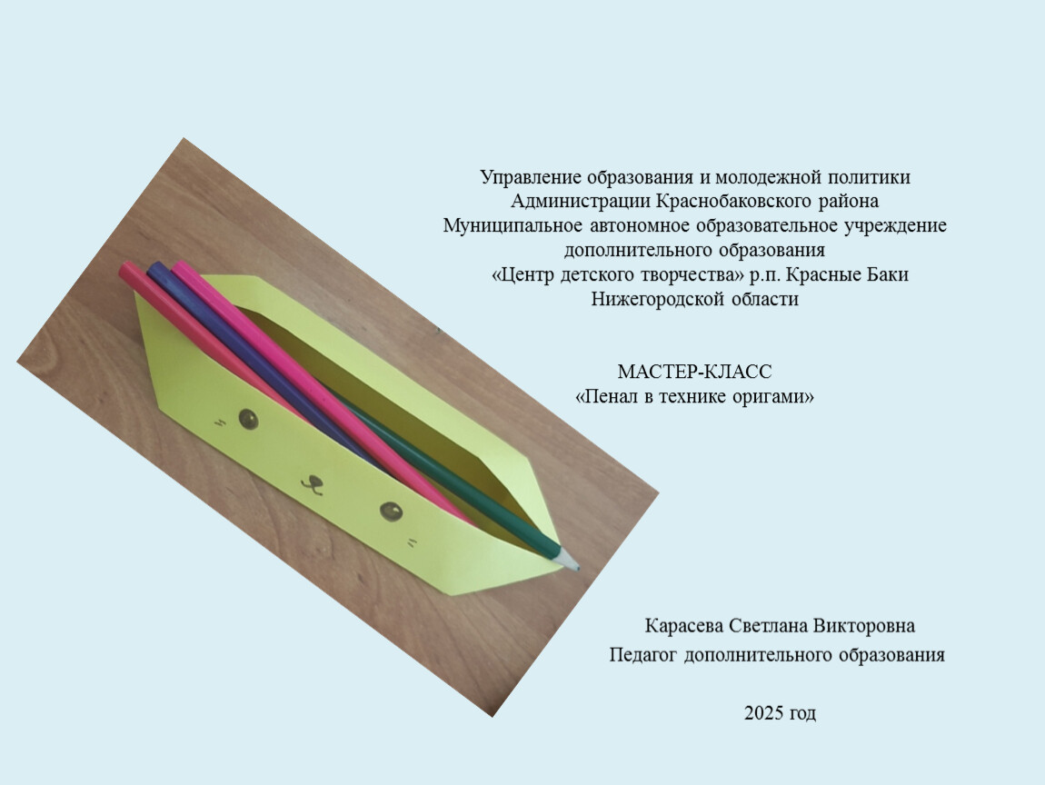 Управление образования и молодежной политики Администрации Краснобаковского районаМуниципальное автономное образовательное учреждение дополнительного образования «Центр детского творчества» р.п. Красные Баки Нижегородской областиМАСТЕР-КЛАСС «Пенал в технике оригами»