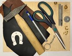 Шаблон, кожа, хольнитены (односторонние или двухсторонние 6*6 мм), ножницы портновские, ручка или мел портновский, кольцо для брелока с карабином, набор инструментов (доска деревянная, молоток, набор инструментов для установки хольнитенов, пробойник).