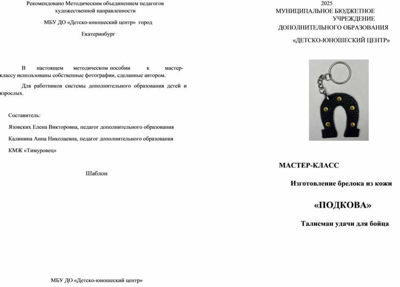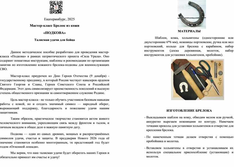 Данное методическое пособие разработано для проведения мастер-класса «Подкова» в рамках патриотического проекта «Сила Урала». Оно содержит пошаговые инструкции, шаблоны и рекомендации по организации занятия по изготовлению кожаного брелока-подковы для военнослужащих СВО.